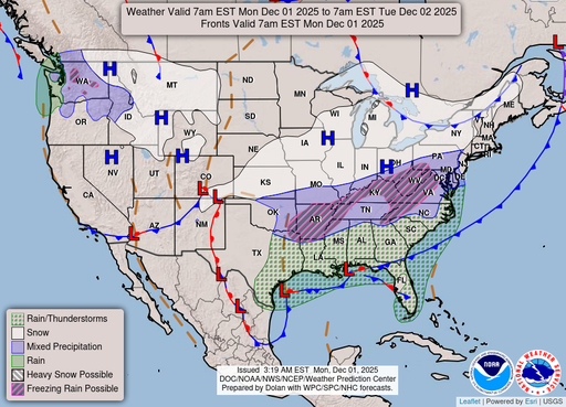 Partly cloudy, with a low around 32. Northwest wind around 12 mph. New rainfall amounts between a tenth and quarter of an inch possible.