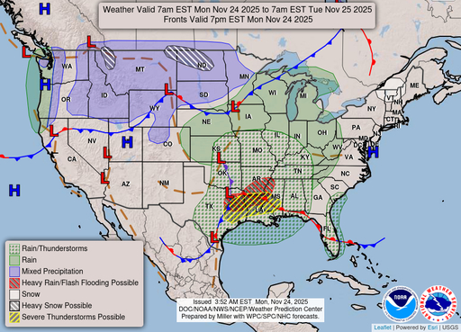 Rain. Mostly cloudy, with a low around 50. South wind around 7 mph. Chance of precipitation is 80%. New rainfall amounts between a quarter and half of an inch possible.