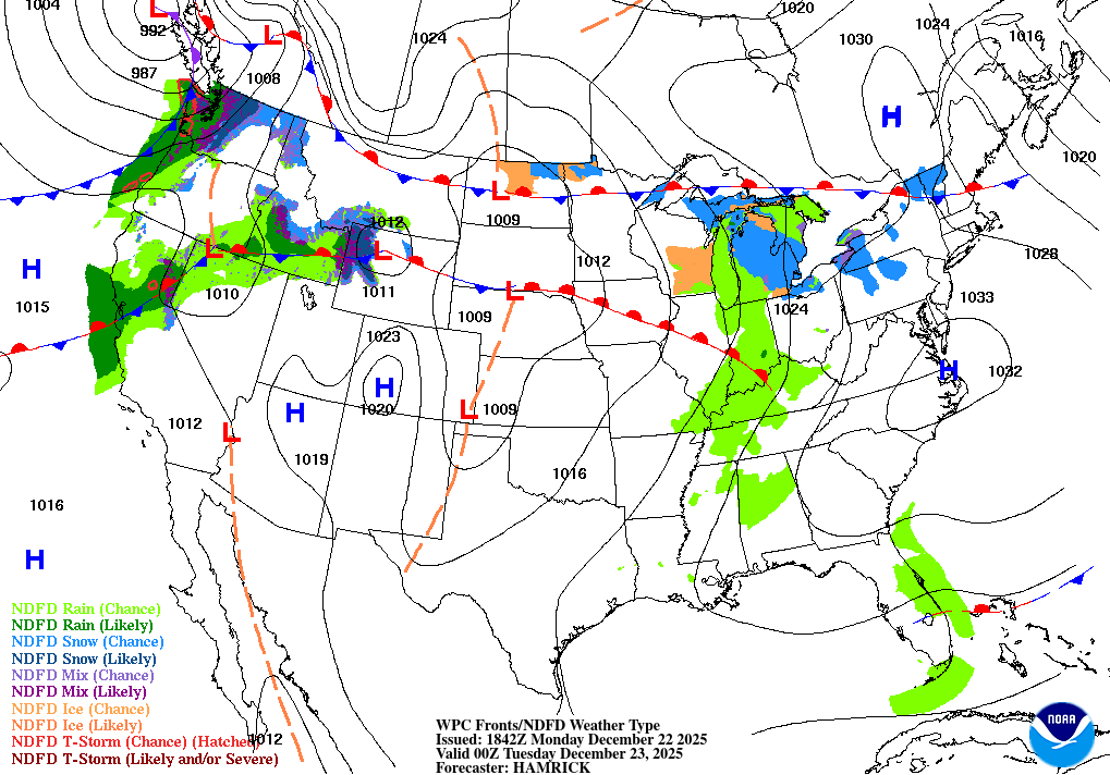 A slight chance of rain before 11pm, then a chance of snow. Mostly cloudy, with a low around 28. Southwest wind around 6 mph. Chance of precipitation is 40%.