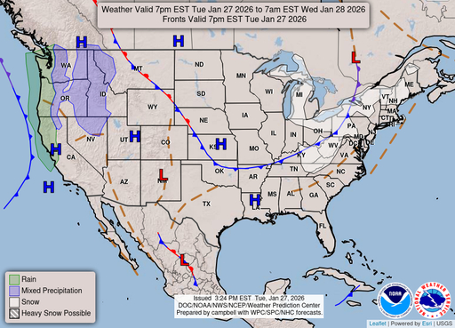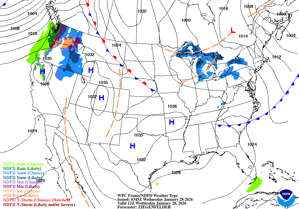 A slight chance of snow before 8am. Mostly sunny, with a high near 33. Northwest wind 8 to 12 mph, with gusts as high as 25 mph.