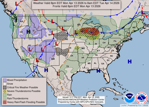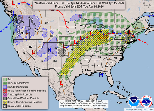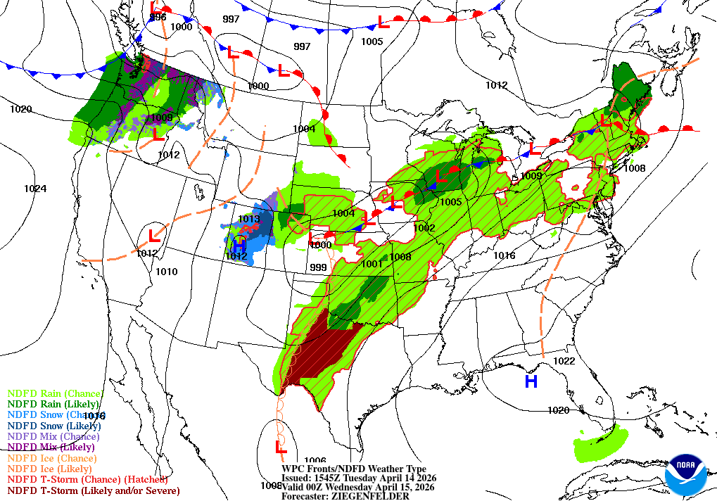A chance of rain showers before 8pm, then a chance of showers and thunderstorms. Mostly cloudy, with a low around 46. Northwest wind around 5 mph. Chance of precipitation is 40%.