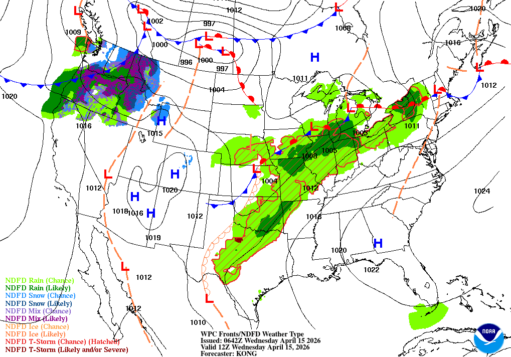 A chance of showers and thunderstorms before 8pm, then patchy fog and showers and thunderstorms likely. Mostly cloudy, with a low around 45. Northeast wind around 5 mph. Chance of precipitation is 60%. New rainfall amounts between a tenth and quarter of an inch possible.