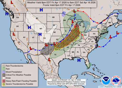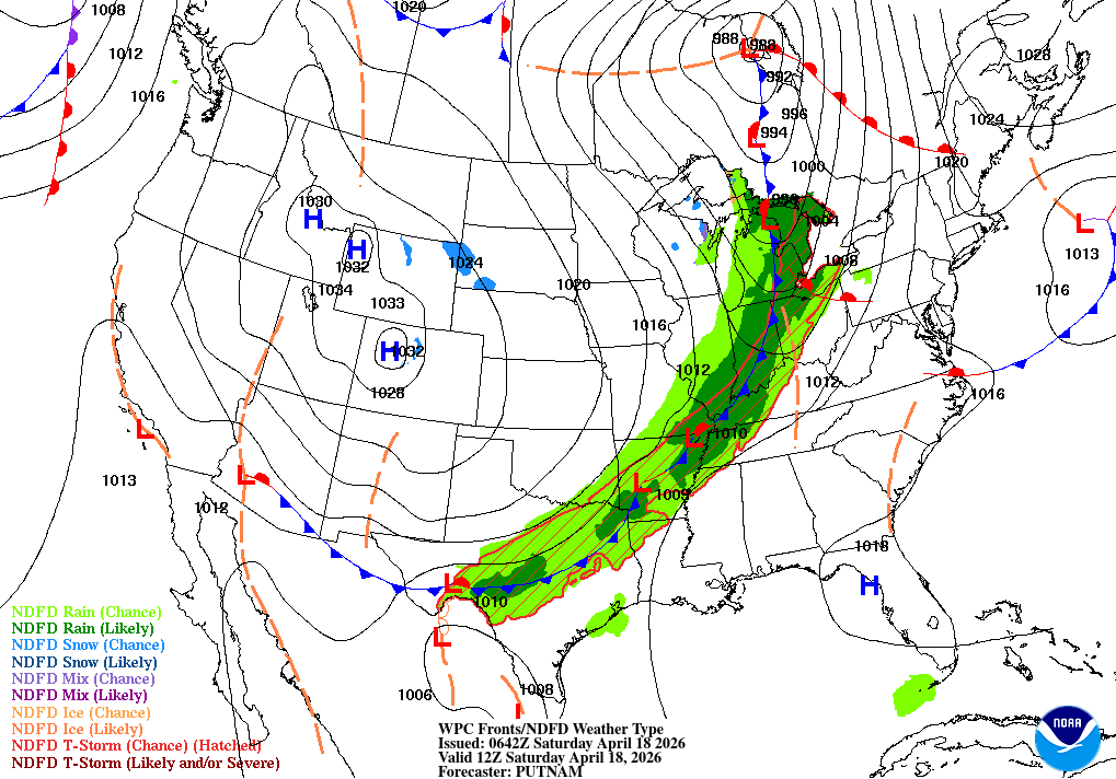 Patchy fog and a slight chance of rain showers before 8am, then patchy fog and showers and thunderstorms likely between 8am and 9am, then a chance of rain between 9am and 10am, then rain and patchy fog between 10am and 4pm, then patchy fog and rain and snow likely. Cloudy, with a high near 53. Southwest wind 3 to 8 mph. Chance of precipitation is 100%. New rainfall amounts between a quarter and half of an inch possible.