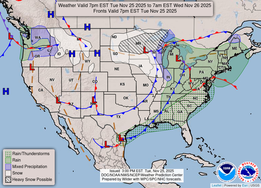 Rain and patchy fog. Cloudy, with a low around 45. South wind around 9 mph, with gusts as high as 22 mph. Chance of precipitation is 100%. New rainfall amounts between a quarter and half of an inch possible.