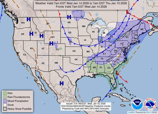 A chance of rain before 2am, then a chance of snow. Mostly cloudy, with a low around 28. Southwest wind around 6 mph. Chance of precipitation is 40%.