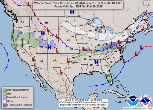 A chance of rain after 9pm. Mostly cloudy, with a low around 32. South wind around 5 mph. Chance of precipitation is 30%.