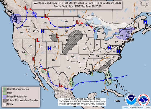 A chance of showers and thunderstorms before 2am, then showers and thunderstorms likely. Mostly cloudy, with a low around 48. Chance of precipitation is 70%.