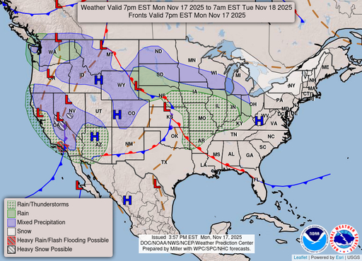 Rain. Cloudy, with a low around 38. Southeast wind around 3 mph. Chance of precipitation is 80%. New rainfall amounts between a quarter and half of an inch possible.