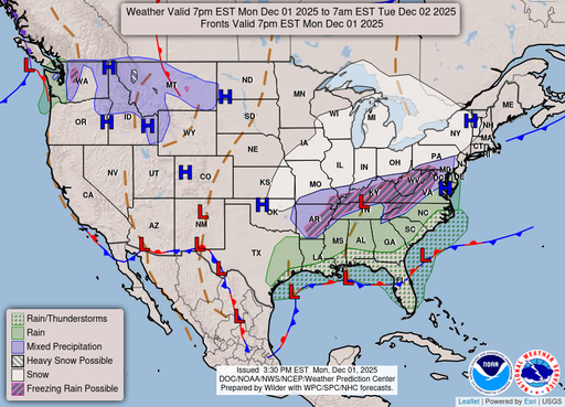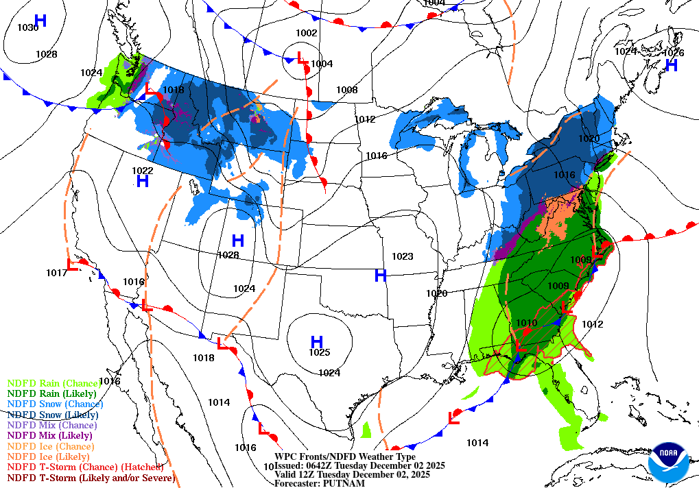 Atlantic Coastal Waters from Altamaha Sound GA to Flagler Beach FL out to 60 nm. Seas are provided as a range of the average height of the highest 1/3 of the waves, along with the occasional height of the average highest 1/10 of the waves. A warm front will continue to lift north of area waters through mid- morning as an area of low pressure lifts northeast out of the Gulf and tracks northeast of the region through tonight. A cold front will move through the area this afternoon into evening, with chances for showers and an isolated thunderstorm. Small Craft Advisory conditions over much of the coastal waters will continue through tonight due to elevated winds and seas. Weak high pressure will settle into the region through Wednesday and Thursday before another frontal system affects the area waters on Friday and Saturday increasing the chances of showers and higher winds once again. .GULF STREAM. The approximate location of the west wall of the Gulf Stream as of Nov 29, 2025 at 1200 UTC. 64 nautical miles east of Flagler Beach. 78 nautical miles east southeast of Saint Augustine Beach. 91 nautical miles east of Jacksonville Beach. 94 nautical miles east of St Simons Island. This data courtesy of the Naval Oceanographic Office.