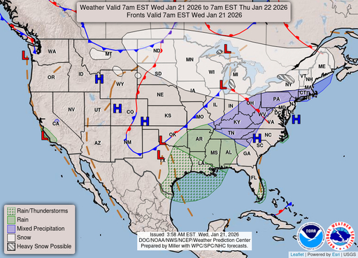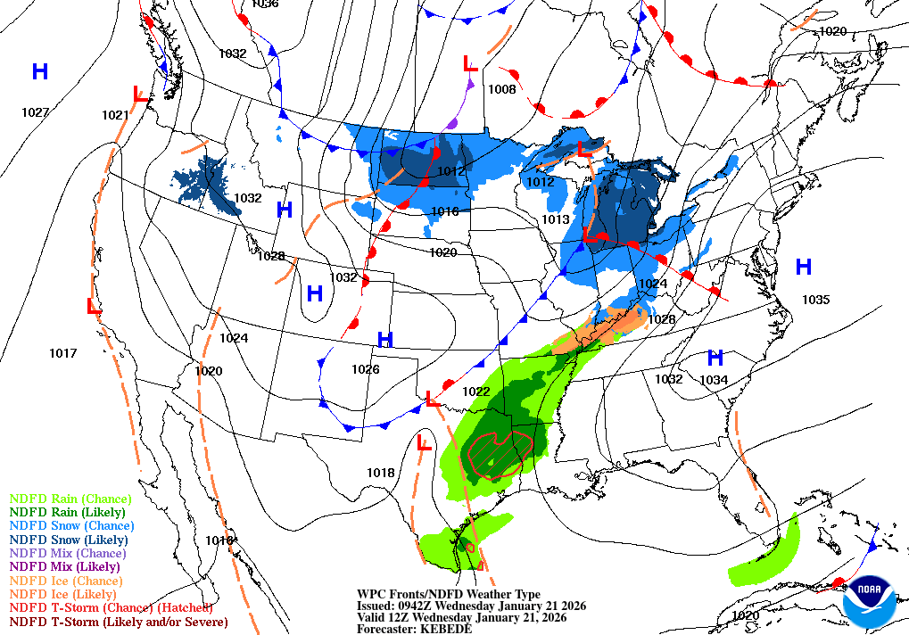 Atlantic Coastal Waters from Altamaha Sound GA to Flagler Beach FL out to 60 nm. Seas are provided as a range of the average height of the highest 1/3 of the waves, along with the occasional height of the average highest 1/10 of the waves. High pressure centered along the Mid-Atlantic coast will push offshore today, with this feature extending its axis southwestward along the southeastern seaboard through Friday. Breezy northeasterly winds across the northeast Florida waters this morning will gradually diminish this afternoon, with light northerly winds then prevailing through Friday. A developing winter storm system over the central and southern United States late this week will and Arctic high pressure will drive a cold front southward across our waters on Friday night and Saturday, with a surge of northeasterly winds expected to briefly overspread our local waters from north to south early this weekend. Scattered showers may accompany this frontal passage, with a wave of low pressure then developing along this boundary near our region by Saturday night and Sunday. This storm system's warm front will lift northeastward across our local waters, resulting in winds shifting to southwesterly, with chances for showers and a few embedded thunderstorms increasing by late in the weekend. Another cold front will cross our local waters by Sunday night and Monday, with strengthening north-northwesterly winds forecast in the wake of this frontal passage early next week. .GULF STREAM. The approximate location of the west wall of the Gulf Stream as of Jan 20, 2026 at 0000 UTC. 50 nautical miles east of Flagler Beach. 53 nautical miles east of Saint Augustine Beach. 64 nautical miles east southeast of Jacksonville Beach. 76 nautical miles east southeast of St Simons Island. This data derived from NCEP Global RTOFS model.