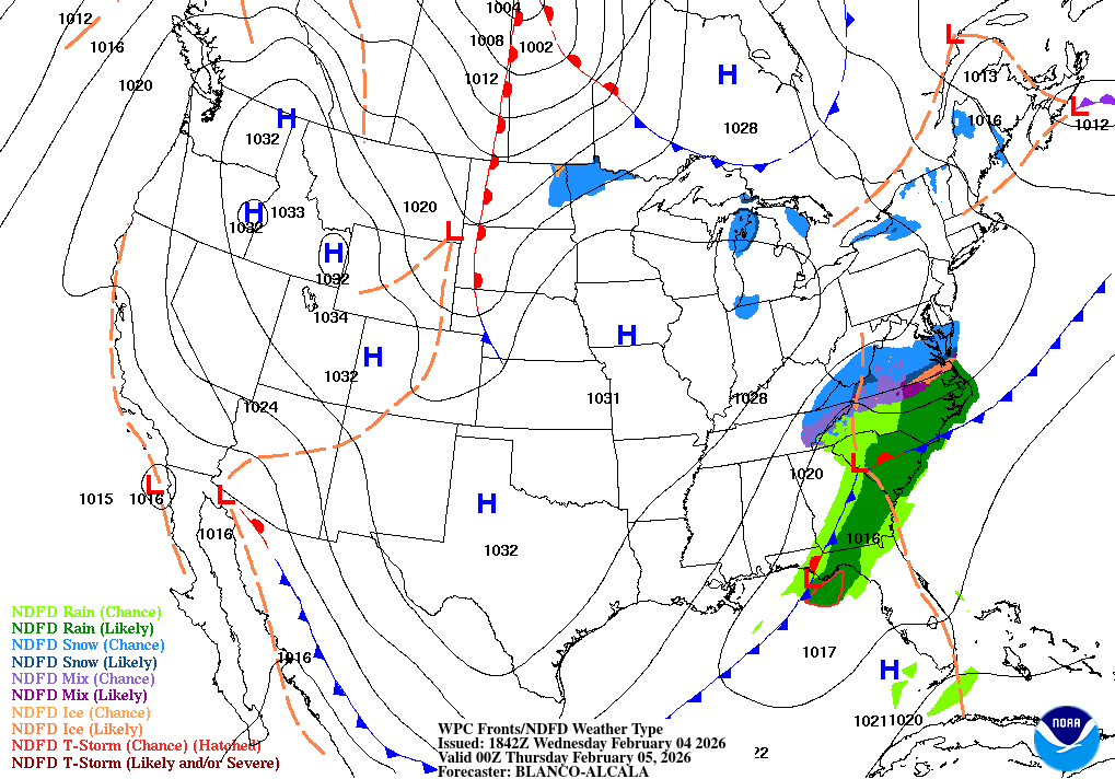 Atlantic Coastal Waters from Altamaha Sound GA to Flagler Beach FL out to 60 nm. Seas are provided as a range of the average height of the highest 1/3 of the waves, along with the occasional height of the average highest 1/10 of the waves. Offshore winds continue with minimal waves this afternoon. An approaching cold front will move across the waters late tonight. Gusty northwesterly winds behind the front will lead to a period of Small Craft Advisory conditions Thursday and Thursday night. After a brief lull in the winds Friday morning, another cold front will clip the waters resulting in another uptick in winds to Small Craft Advisory levels through Saturday morning. High pressure building to the north behind the front will shift winds to onshore, out of the northeast, and lower speeds by Saturday afternoon. .GULF STREAM. The approximate location of the west wall of the Gulf Stream as of Feb 04, 2026 at 0000 UTC. 42 nautical miles east of Flagler Beach. 49 nautical miles east of Saint Augustine Beach. 60 nautical miles east southeast of Jacksonville Beach. 76 nautical miles east southeast of St Simons Island. This data derived from NCEP Global RTOFS model.