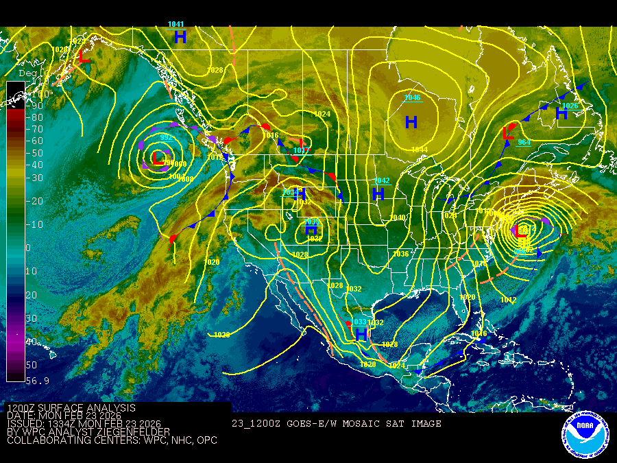 Atlantic Coastal Waters from Altamaha Sound GA to Flagler Beach FL out to 60 nm. Seas are provided as a range of the average height of the highest 1/3 of the waves, along with the occasional height of the average highest 1/10 of the waves. Intense low pressure situated off the Mid-Atlantic coast early this morning will lift northeast through tonight, reaching Atlantic Canada by early Tuesday morning. Meanwhile, Arctic high pressure building southeastward from the Upper Midwest will gradually weaken as it settles over the Florida panhandle by sunrise on Tuesday. Small Craft Advisory conditions expected rest of today and tonight before winds and seas gradually subside on Tuesday as weakening high pressure shifts southeastward towards the Florida peninsula. This high pressure center will then shift offshore of the southeast Florida coast by Wednesday afternoon, with breezy south- southwesterly winds prevailing across our local waters through Friday. Showers and possibly a few thunderstorms will overspread our local waters on Friday and Friday night as a frontal boundary stalls over our area. A wave of weak low pressure potentially developing along this front could keep shower chances in place for at least a portion of the upcoming weekend. GULF STREAM. The approximate location of the west wall of the Gulf Stream as of Feb 22, 2026 at 0000 UTC. 62 nautical miles east of Flagler Beach. 62 nautical miles east of Saint Augustine Beach. 74 nautical miles east southeast of Jacksonville Beach. 80 nautical miles east southeast of St Simons Island. This data derived from NCEP Global RTOFS model.