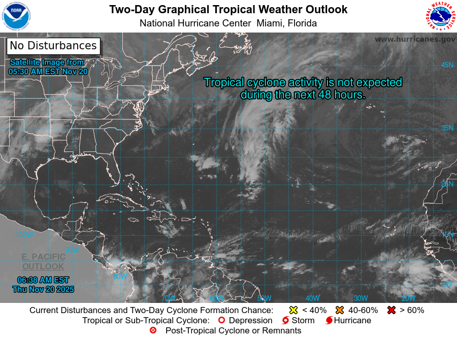 Atlantic Coastal Waters from Altamaha Sound GA to Flagler Beach FL out to 60 nm. Seas are provided as a range of the average height of the highest 1/3 of the waves, along with the occasional height of the average highest 1/10 of the waves. High pressure ridging over the Florida panhandle will weaken while shifting slowly southeastward by Friday afternoon and Saturday. A weakening and mostly dry frontal boundary will then push southward through the Georgia waters on Saturday night, with this boundary pushing across the northeast FL waters on Sunday morning. High pressure will build east-southeastward from the Upper Midwest on Sunday night towards the Mid-Atlantic states by early Tuesday, with breezy onshore winds developing across our local waters from Sunday afternoon through Monday afternoon. A stronger cold front may then push eastward across the southeastern states next Wednesday and Wednesday night, with southerly winds expected to develop ahead of this front beginning on Tuesday. .GULF STREAM. The approximate location of the west wall of the Gulf Stream as of Nov 18, 2025 at 1200 UTC. 50 nautical miles east of Flagler Beach. 59 nautical miles east of Saint Augustine Beach. 76 nautical miles east of Jacksonville Beach. 85 nautical miles east of St Simons Island. This data courtesy of the Naval Oceanographic Office.