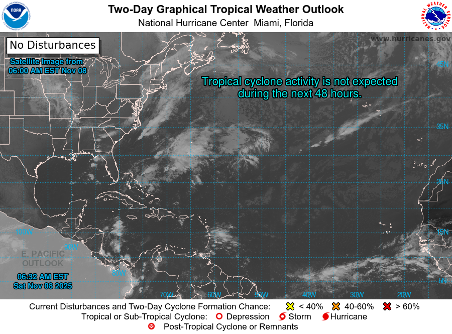 Atlantic coastal waters from Flagler Beach to Jupiter Inlet out 60 nm. Seas are provided as a range of the average height of the highest one third of the waves, along with the occasional height of the average highest ten percent of the waves. GULF STREAM HAZARDS.None. The approximate location of the west wall of the Gulf Stream based on the Real Time Ocean Forecast System as of Saturday, November 8th, 2025. 43 nautical miles east of Ponce Inlet. 31 nautical miles east of Port Canaveral. 28 nautical miles east of Sebastian Inlet. 18 nautical miles east of Fort Pierce Inlet. 12 nautical miles east of Saint Lucie Inlet.