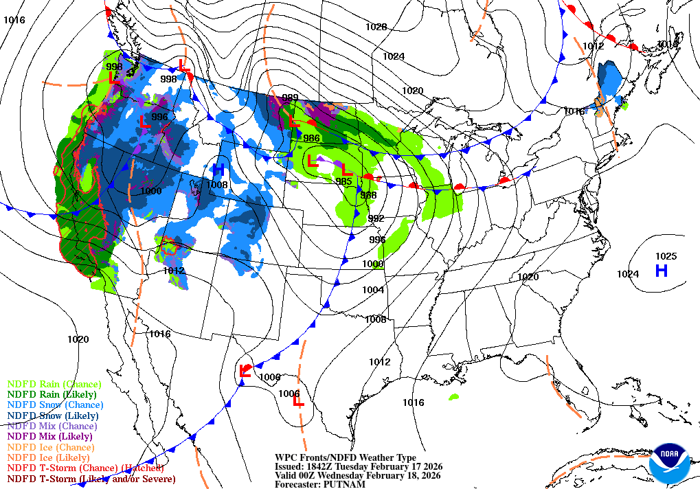 N winds 15 to 20 kt Waves 1 to 2 ft Rain likely through the day Snow likely, then a chance of snow after midnight