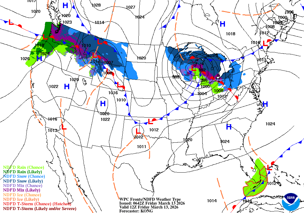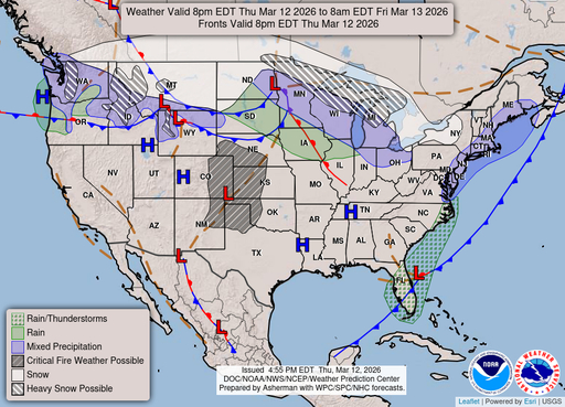 Showers and thunderstorms before 2am, then a slight chance of rain and snow showers. Mostly cloudy, with a low around 35. Chance of precipitation is 100%.