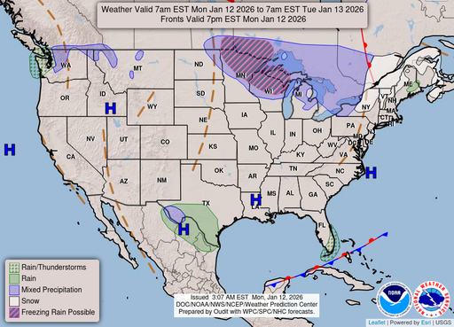 A chance of rain and snow before 7pm, then a chance of rain and snow. Mostly cloudy, with a low around 26. Chance of precipitation is 50%.