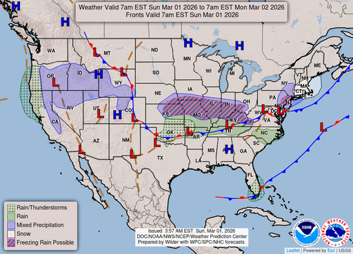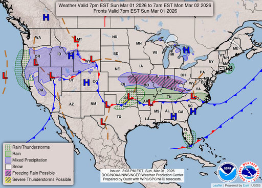 A slight chance of snow before 1am, then a chance of rain and snow. Mostly cloudy, with a low around 34. East wind around 6 mph. Chance of precipitation is 50%.