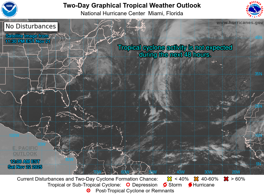 Atlantic coastal waters from Jupiter Inlet to Ocean Reef out to 60 nm and Gulf coastal waters from East Cape Sable to Chokoloskee out 20 nm and Chokoloskee to Bonita Beach out 60 nm.including the waters of Biscayne Bay and Lake Okeechobee. Seas are provided as a range of the average height of the highest 1/3 of the waves.along with the occasional height of the average highest 10 percent of the waves. A gentle to moderate easterly breeze will continue across most of the local waters today. The exception to this will be across the Gulf waters where winds may shift and become northwesterly each afternoon as a Gulf breeze develops. A weak front will approach on Sunday, with winds gradually veering from the west/northwest. Seas will range between 1-3 feet. Gulf Stream Hazards: None. The approximate location of the west wall of the Gulf Stream as of Nov 22, 2025. 22 nautical miles north northeast of Fowey Rocks. 7 nautical miles east of Port Everglades. 10 nautical miles east southeast of Lake Worth. 11 nautical miles east northeast of Jupiter Inlet. This data courtesy of the Naval Oceanographic Office.