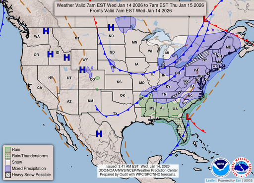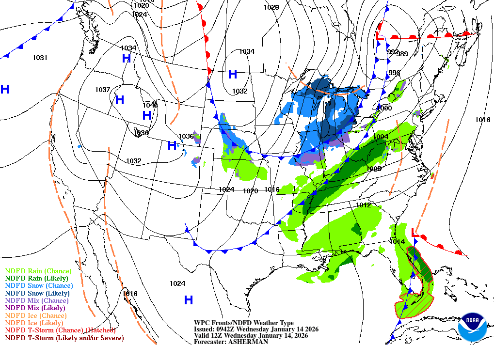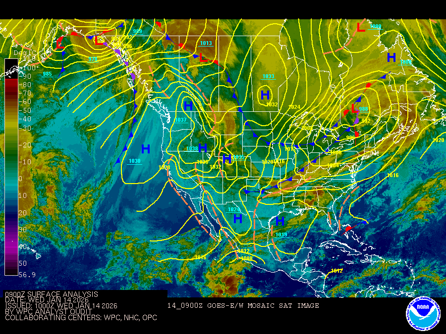 Atlantic coastal waters from Flagler Beach to Jupiter Inlet out 60 nm. Seas are provided as a range of the average height of the highest one third of the waves, along with the occasional height of the average highest ten percent of the waves. GULF STREAM HAZARDS.West winds 15 to 20 knots this afternoon, especially north of Sebastian Inlet. The approximate location of the west wall of the Gulf Stream based on the Real Time Ocean Forecast System as of Wednesday, January 14th, 2026. 43 nautical miles east of Ponce Inlet. 31 nautical miles east of Port Canaveral. 26 nautical miles east of Sebastian Inlet. 18 nautical miles east of Fort Pierce Inlet. 12 nautical miles east of Saint Lucie Inlet.