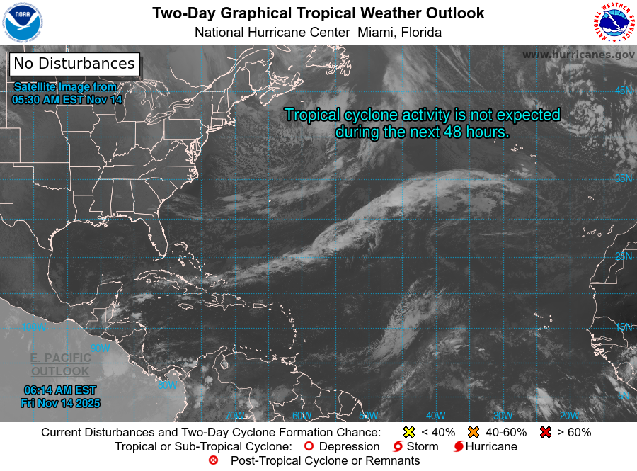 Atlantic coastal waters from Flagler Beach to Jupiter Inlet out 60 nm. Seas are provided as a range of the average height of the highest one third of the waves, along with the occasional height of the average highest ten percent of the waves. GULF STREAM HAZARDS.None. The approximate location of the west wall of the Gulf Stream based on the Real Time Ocean Forecast System as of Thursday, November 13th, 2025. 46 nautical miles east of Ponce Inlet. 34 nautical miles east of Port Canaveral. 26 nautical miles east of Sebastian Inlet. 16 nautical miles east of Fort Pierce Inlet. 9 nautical miles east of Saint Lucie Inlet.