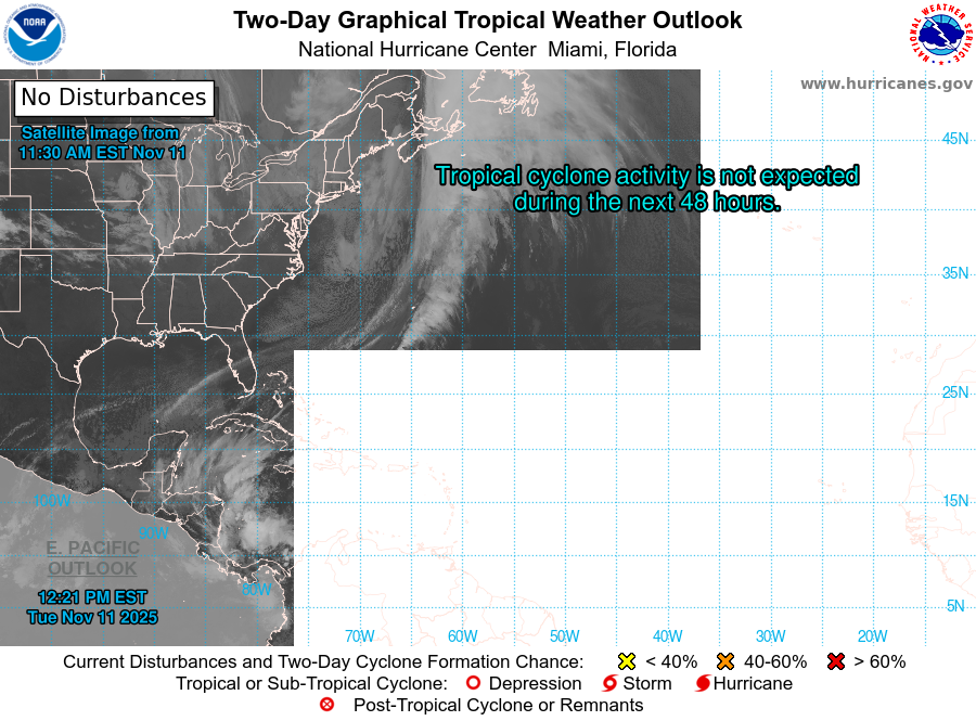 Atlantic coastal waters from Flagler Beach to Jupiter Inlet out 60 nm. Seas are provided as a range of the average height of the highest one third of the waves, along with the occasional height of the average highest ten percent of the waves. GULF STREAM HAZARDS.Gusty North winds 15 to 25 knots this evening decreasing near 10 knots overnight. Seas subsiding below 7 feet by sunrise Wednesday. The approximate location of the west wall of the Gulf Stream based on the Real Time Ocean Forecast System as of Tuesday, November 11th, 2025. 50 nautical miles east of Ponce Inlet. 36 nautical miles east of Port Canaveral. 31 nautical miles east of Sebastian Inlet. 23 nautical miles east of Fort Pierce Inlet. 16 nautical miles east of Saint Lucie Inlet.