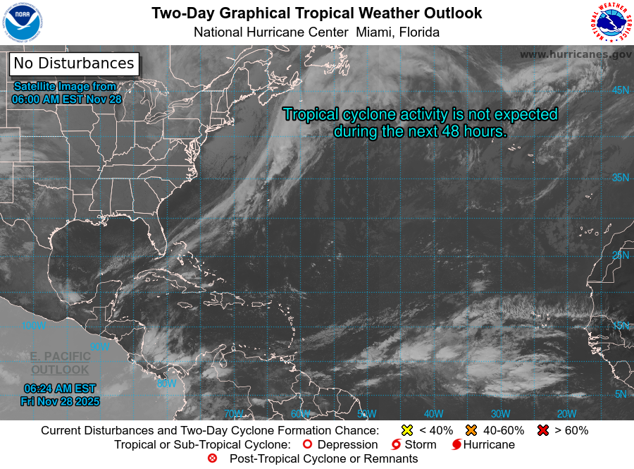 Atlantic Coastal Waters from Altamaha Sound GA to Flagler Beach FL out to 60 nm. Seas are provided as a range of the average height of the highest 1/3 of the waves, along with the occasional height of the average highest 1/10 of the waves. Gusty northerly winds and elevated seas will continue Small Craft Advisory conditions today as high pressure builds north of the region. Onshore flow weakens tonight into Saturday as the high builds to the northeast. A coastal trough develops Sunday and Monday with a few coastal showers. A stronger frontal system approaches late Monday into Tuesday with southerly winds nearing Small Craft levels over at least the outer waters and a chance of thunderstorms. The front is expected to push south of the local waters by Tuesday evening. High pressure builds quickly over the region Tuesday night into Wednesday with northerly winds below Small Craft levels. .GULF STREAM. The approximate location of the west wall of the Gulf Stream as of Nov 27, 2025 at 1200 UTC. 43 nautical miles east of Flagler Beach. 44 nautical miles east northeast of Saint Augustine Beach. 41 nautical miles east of Jacksonville Beach. 55 nautical miles east southeast of St Simons Island. This data courtesy of the Naval Oceanographic Office.
