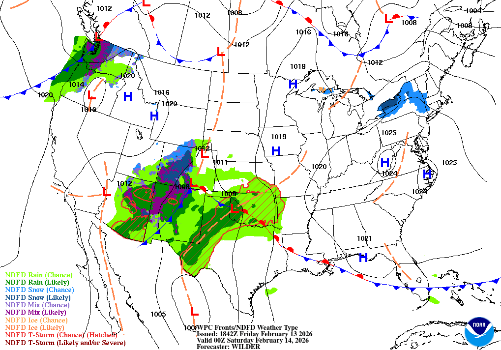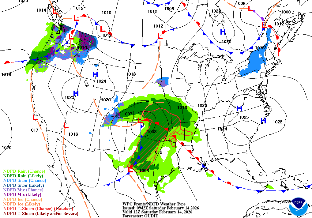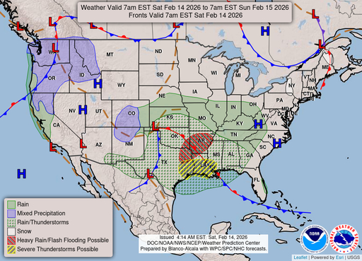 Rain before 4am, then rain and a slight chance of thunderstorms. Cloudy, with a low around 54. South southeast wind 20 to 25 mph, with gusts as high as 35 mph. Chance of precipitation is 100%. New rainfall amounts between 1 and 2 inches possible.