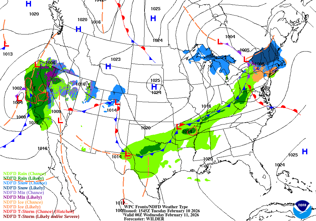 Rain. Mostly cloudy, with a low around 54. South southwest wind 15 to 30 mph, with gusts as high as 40 mph. Chance of precipitation is 80%. New rainfall amounts between a quarter and half of an inch possible.