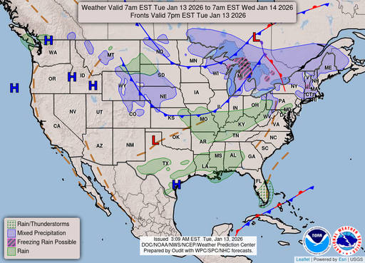 Rain likely before 4am, then a chance of snow. Mostly cloudy, with a low around 25. West wind 2 to 15 mph, with gusts as high as 25 mph. Chance of precipitation is 60%. New rainfall amounts less than a tenth of an inch possible.