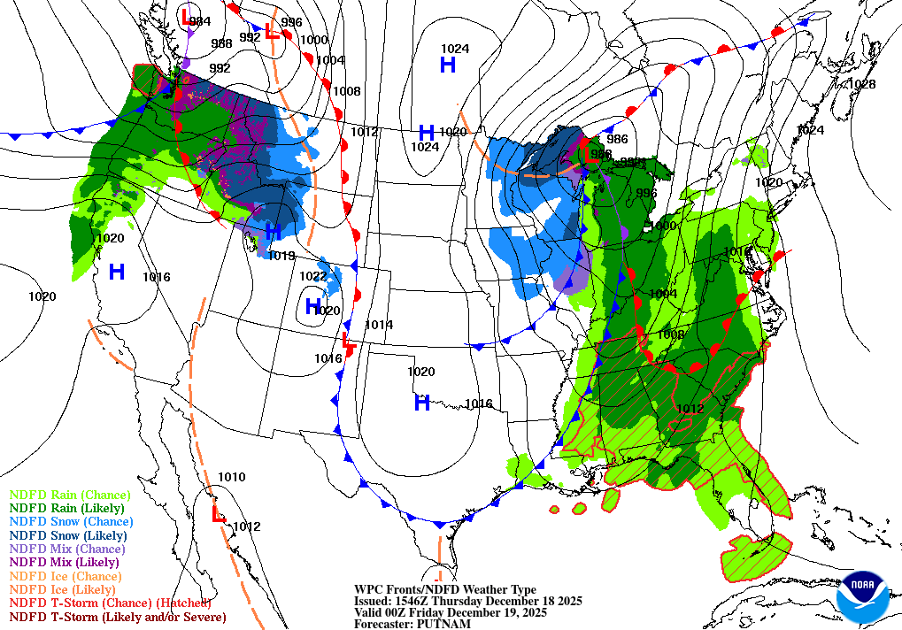 A chance of rain showers before midnight, then rain showers likely and patchy fog. Mostly cloudy. Low around 44, with temperatures rising to around 46 overnight. North northeast wind around 2 mph. Chance of precipitation is 60%. New rainfall amounts less than a tenth of an inch possible.