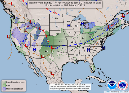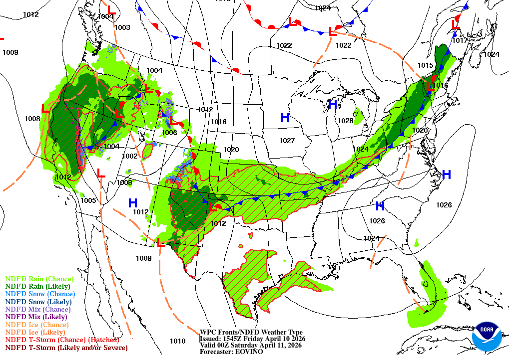 A chance of rain before 8am, then showers and thunderstorms. Mostly cloudy. High near 61, with temperatures falling to around 59 in the afternoon. South southwest wind 2 to 8 mph. Chance of precipitation is 100%. New rainfall amounts between a half and three quarters of an inch possible.