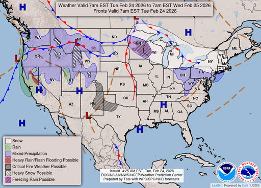 Rain likely. Cloudy. Low around 49, with temperatures rising to around 51 overnight. South southwest wind 2 to 7 mph. Chance of precipitation is 70%. New rainfall amounts between a quarter and half of an inch possible.